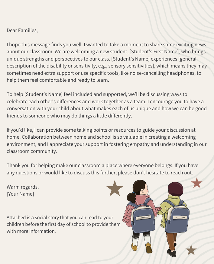 • A customizable letter to send home to parents, offering supportive language and talking points to help families prepare their child to be a kind, inclusive peer.